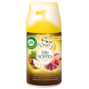 ОписаниеСменный аэрозольный баллон к автоматическому освежителю воздуха Freshmatic, серия Life Scents (Вкус жизни), многослойный аромат, Райское наслаждение (кокос, цветущий миндаль, вишня)
